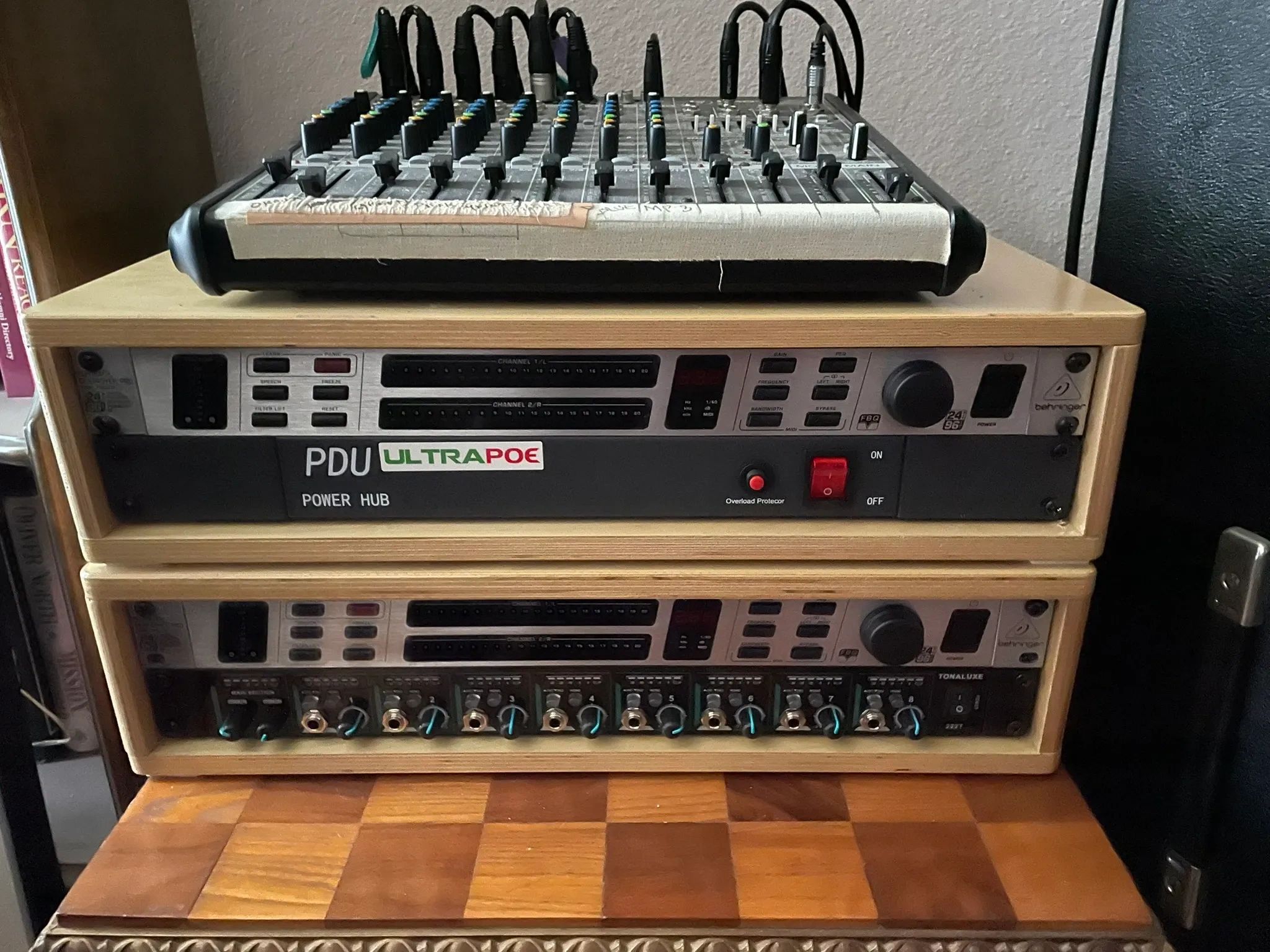 main feed, the signal is sent to the Barringer Tube Tone injector drive then to both the dB30 Signal strength indicator graphics display and to the Rockville RPA5 signal amplifier and finally delivered to the RockVille RPG4x10 PA controller(top) and three other PA output systems.